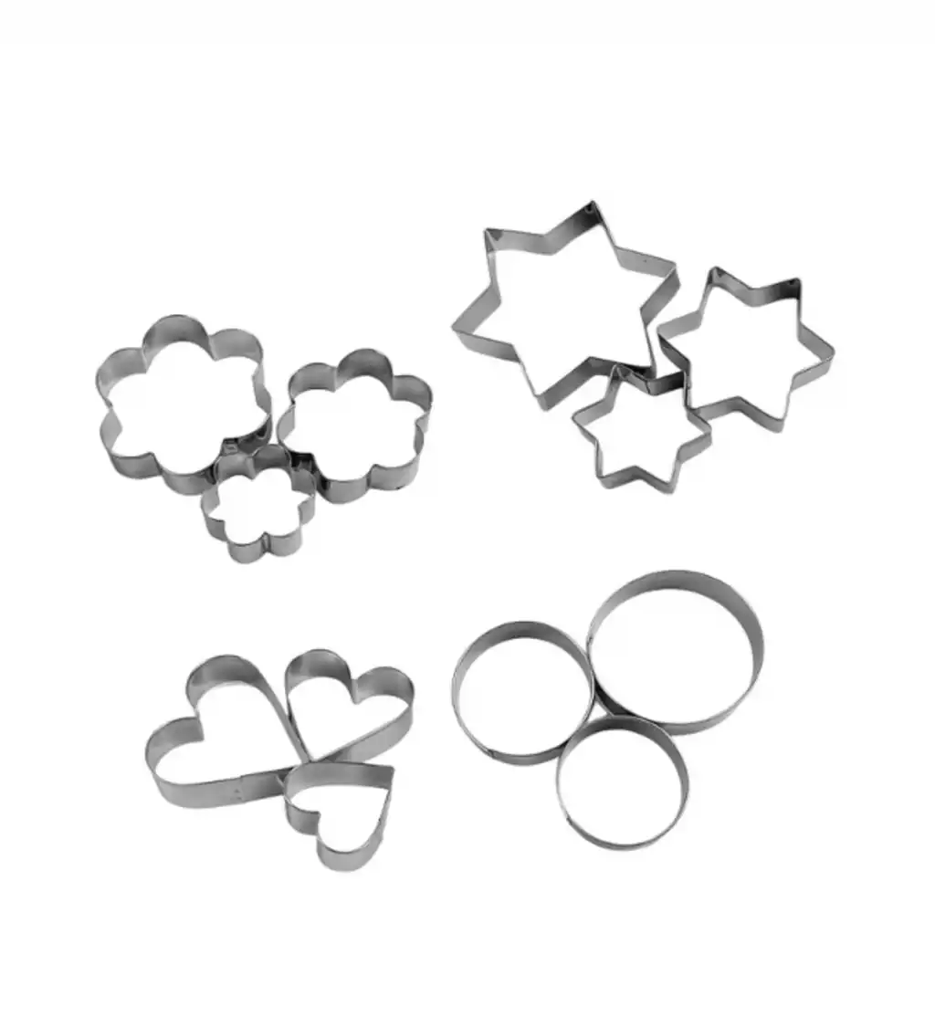 12 ADET PASLANMAZ ÇELİK KURABİYE KALIBI SETİÜrün Özellikleri 12 adet paslanmaz çelik kurabiye kalıbı seti, dayanıklı ve hijyenik yapısıyla mutfakta pratik kullanım sağlar. Kalpler, yıldızlar, çiçekler ve daireler gibi 4 farklı şekli bulunan bu set, her şeklin üç farklı boyutuyla toplam 12 parçadan oluşur. Yalnızca kurabiye hamuru için değil, aynı zamanda sebze, meyve, yumurta veya hamur işi sunumlarında da yaratıcı biçimlendirmeler yapmanıza imkân tanır. Paslanmaz çelik yapısı sayesinde uzun ömürlü kullanım sunar ve kolay temizlenir. Pürüzsüz kenarları sayesinde güvenli bir kullanım deneyimi sağlar. Evde, kafelerde veya pastanelerde dekoratif sunumlar yapmak isteyenler için ideal bir yardımcıdır. Paket İçeriği 1 adet 12 li paslanmaz çelik kurabiye kalıbı seti