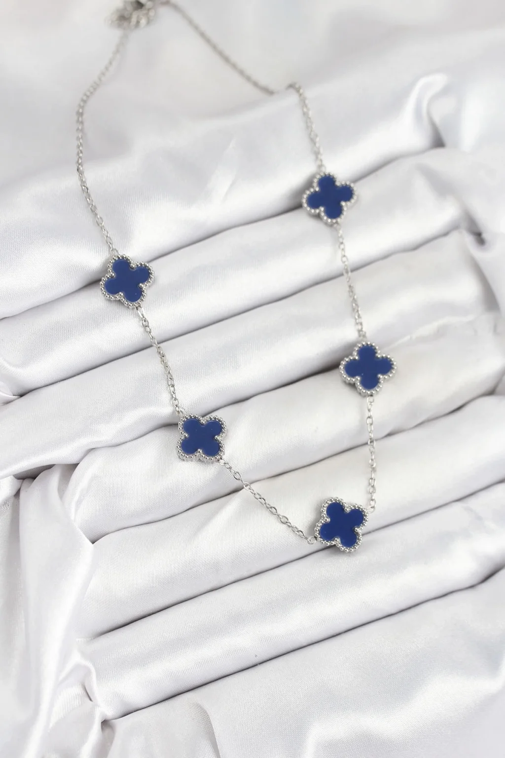 316L Çelik Zincir Gümüş Lacivert Renk Yonca Kadın Kolye
