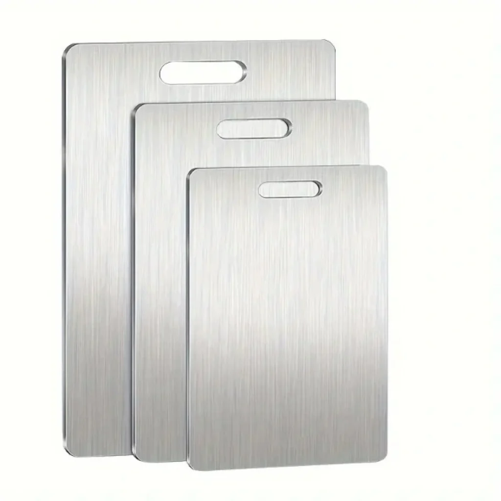 3'LÜ PASLANMAZ ÇELİK KESME TAHTASI SETİ Ürün ÖzellikleriPaslanmaz çelikten üretilmiş olan bu kesme tahtası seti, mutfağınız için ideal bir seçimdir. 3 farklı boyutta sunulan tahtalar, her ihtimale karşı kullanım kolaylığı sağlar. Leke tutmaz, sağlıklıdır ve hijyenik özelliklere sahiptir. Ayrıca paslanmaz özelliği sayesinde uzun ömürlüdür ve yıllarca kullanılabilir.Kesme tahtaları antibakteriyel özelliklere sahip olup, gıda zehirlenmesini önler. Elde veya bulaşık makinasında kolayca yıkanabilir. Farklı boyut seçenekleriyle, sebze, meyve, et gibi farklı malzemeleri rahatça kesebilirsiniz.Paket İçeriği1 Adet 33 x 22.5 cm Boyutunda Paslanmaz Çelik Kesme Tahtası1 Adet 28 x 19.5 cm Boyutunda Paslanmaz Çelik Kesme Tahtası1 Adet 24.5 x 15 cm Boyutunda Paslanmaz Çelik Kesme Tahtası
