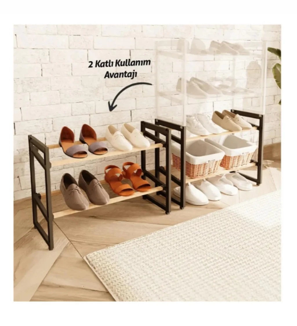 ChatGPT:4 KATLI AHŞAP AYAKKABILIKÜrün Özellikleri4 katlı ahşap ayakkabılık, şık ve modern tasarımıyla evinizin düzenini kolayca sağlamanıza yardımcı olur. 20x65x51 cm boyutundaki kompakt yapısı sayesinde az yer kaplar ve dar alanlarda bile rahatlıkla kullanılabilir. Hem ayakkabılık hem de çok amaçlı raf olarak değerlendirilebilen bu ürün, portatif yapısıyla kolay taşınabilir. Vidasız pratik montaj özelliği sayesinde ekstra bir alete gerek kalmadan hızlıca kurulabilir. Hem dört raflı olarak hem de ayrı ayrı 2 katlı iki ayakkabılık olarak kullanma avantajı sunar.Ahşap rafları ve sağlam metal yan profilleri dayanıklı kullanım sunarken, dekoratif görünümüyle evinize estetik bir hava katar. Hem giriş alanlarında hem de balkon, yatak odası veya kiler gibi farklı mekânlarda düzen sağlamak için idealdir.Paket İçeriği1 adet 4 Katlı Ahşap Ayakkabılık 1 adet 4 Katlı Ahşap Ayakkabılık