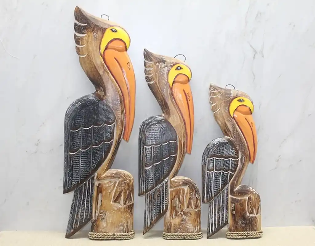 AHŞAP 3'LÜ PELİKAN SETİÜrün ÖzellikleriAhşap 3'lü Pelikan Seti, 40-50-60 cm boyutlarında üçlü dekoratif setten oluşmaktadır. Her bir pelikan, özenle işlenmiş ahşap malzeme ile üretilmiş olup, doğal dokusu ve zarif tasarımıyla ev veya ofis dekorasyonunuza şıklık katacak bir üründür. Setin her bir parçası, doğal renkleriyle birlikte pelikan figürlerini vurgular ve dekoratif amaçla mükemmel bir seçenek sunar.Paket İçeriği1 Adet Ahşap 3'lü Pelikan Seti