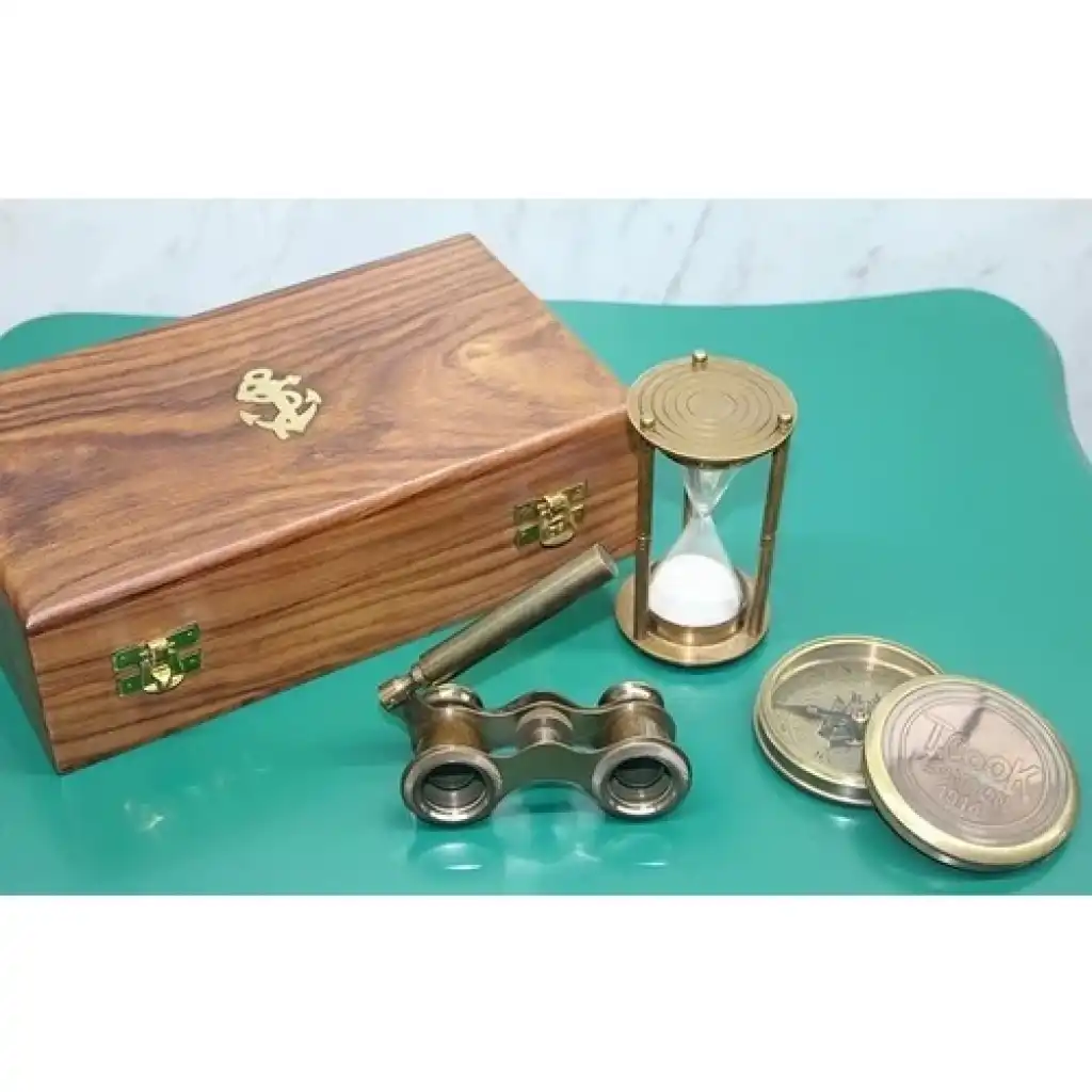 Ahşap Kutulu Pirinç Pusula,kumsaati,dürbün Seti 15682