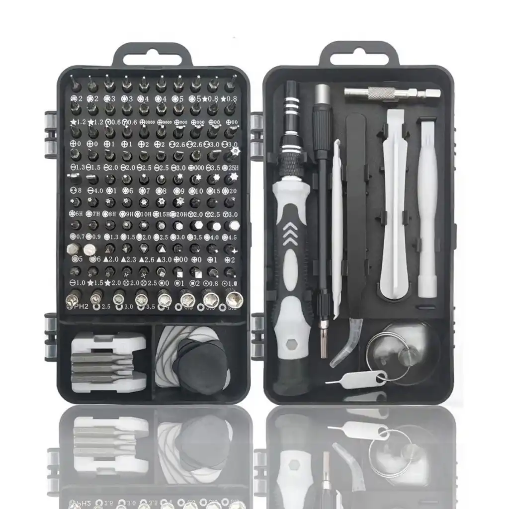 • 115 Parça Çok Amaçlı Set: Farklı tip ve boyutlarda tornavida uçları, onarım aparatları ve aksesuarlar içerir.