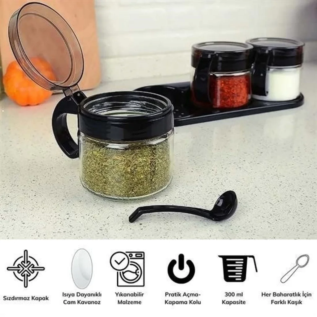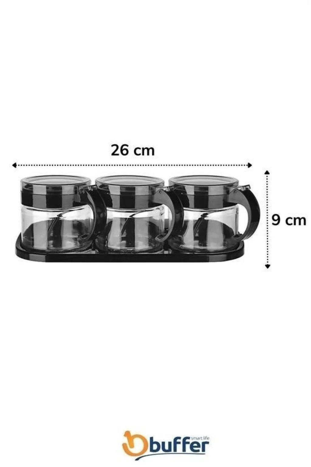 BUFFER® Siyah 3'lü Standlı Kaşıklı Cam Baharatlık Takımı, mutfağınızda dağınık bir şekilde duran baharatlarınızı düzene sokmak için tasarlanmıştır