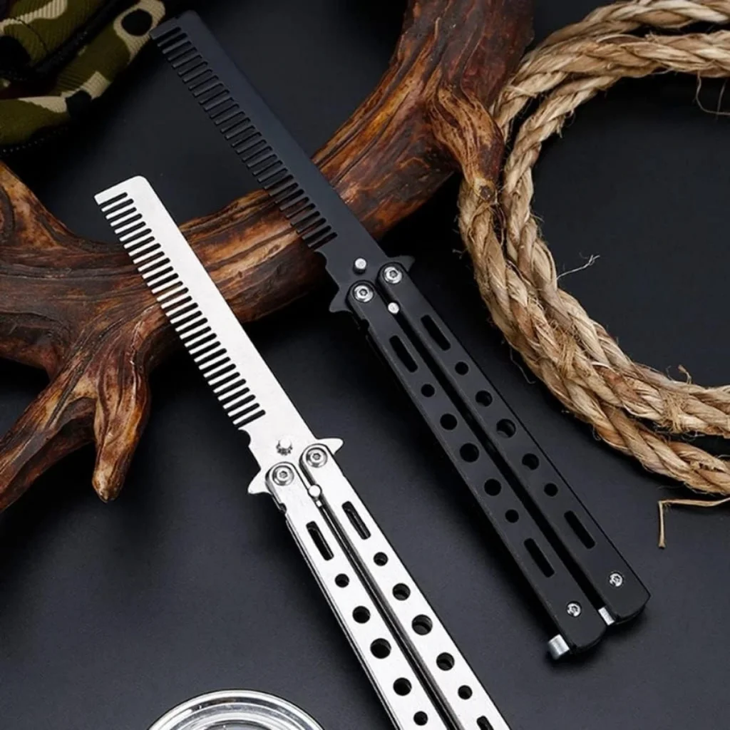 BUFFER® Siyah Katlanabilir Paslanmaz Çelik Kelebek Bıçak Tarak – Sakal & Bıyık Fırçası, Profesyonel Saç Kesimi İçin Tarak