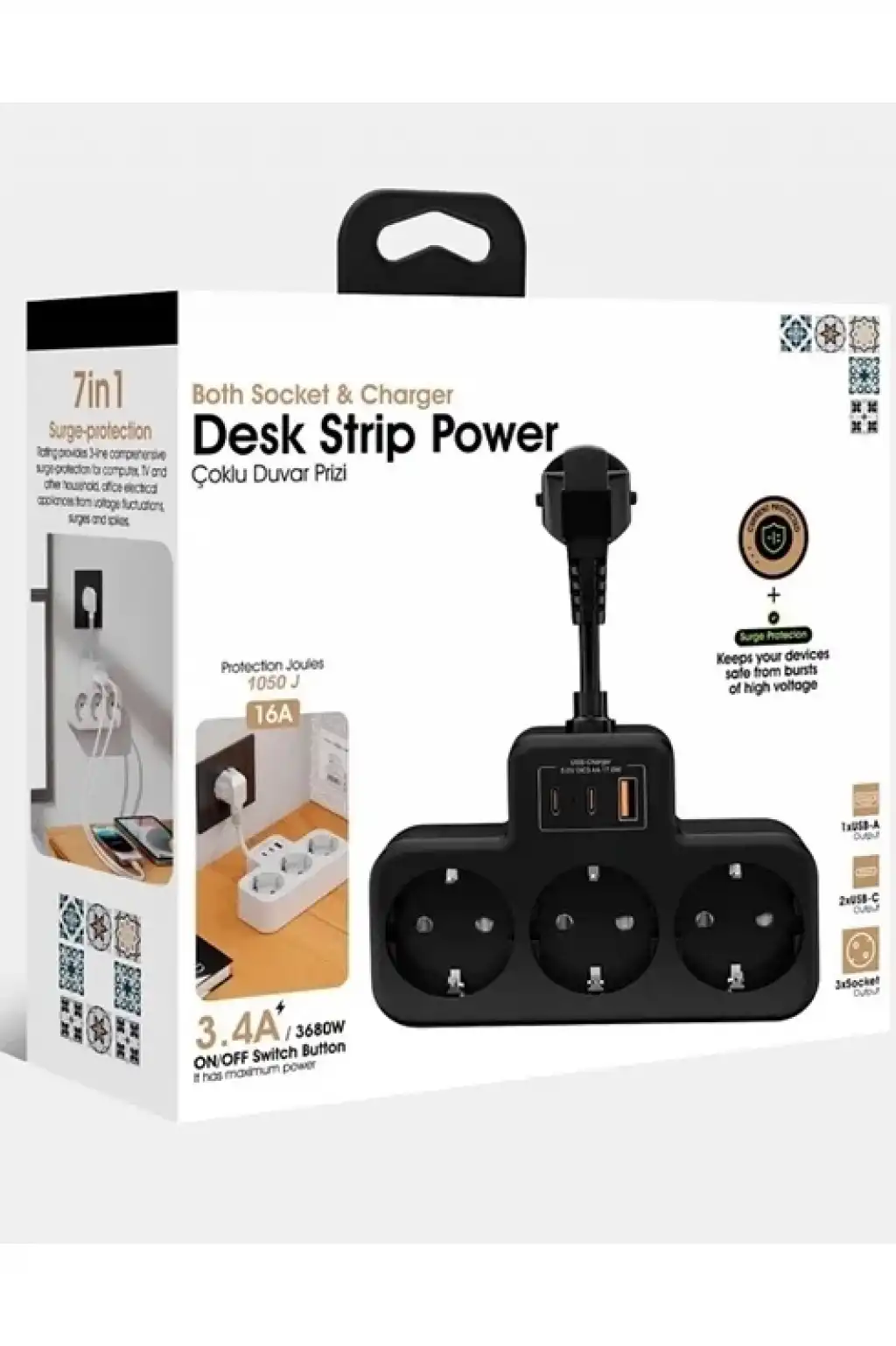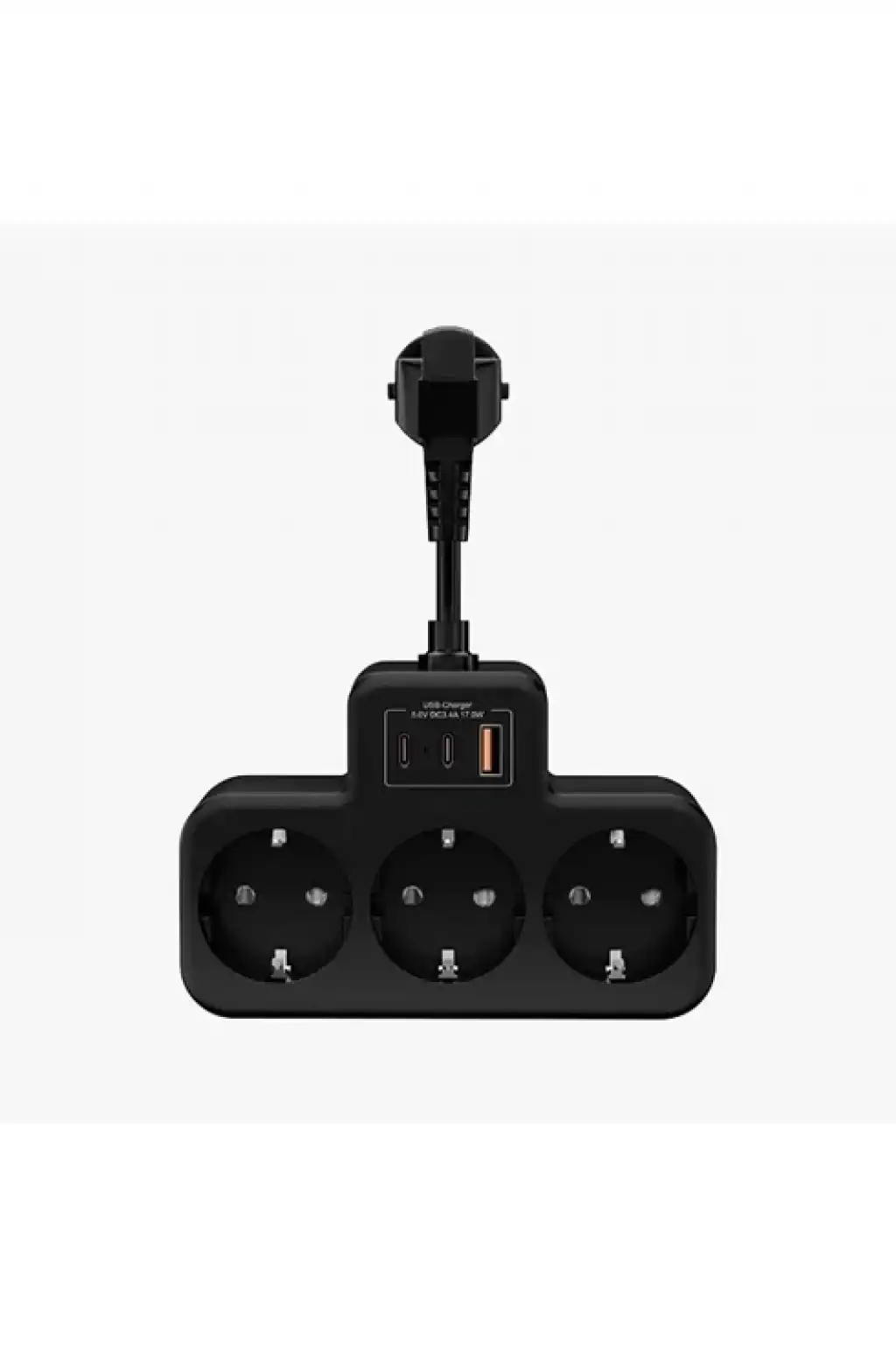 Çoklu Kablolu Priz Yüksek Gerilim Korumalı 3’lü Priz 1x Usb 2x Type-c Çıkışlı Grup Priz Çoğaltıcı Siyah