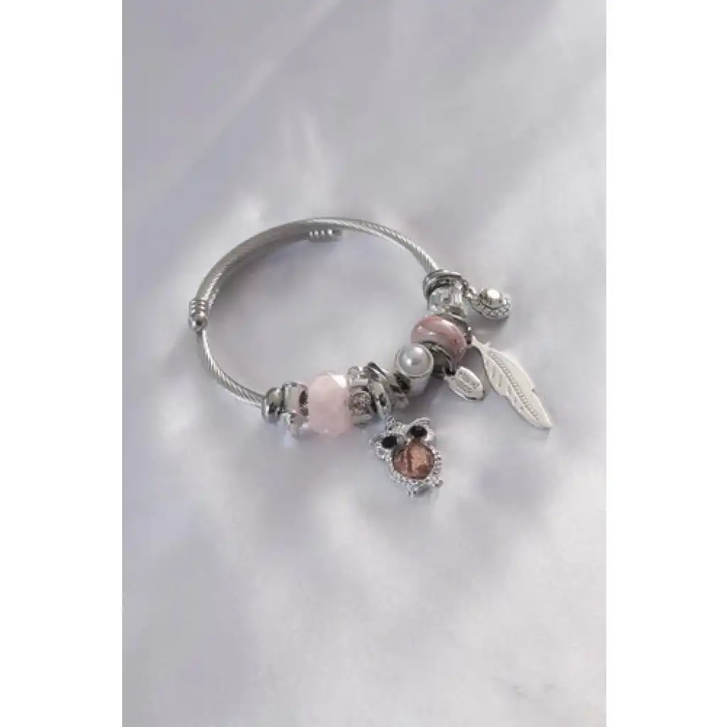 Colezium CLZ943 Çelik Charm Model Pembe Baykuş Figür Yaprak Detay Zirkon Taşlı Kadın Bileklik