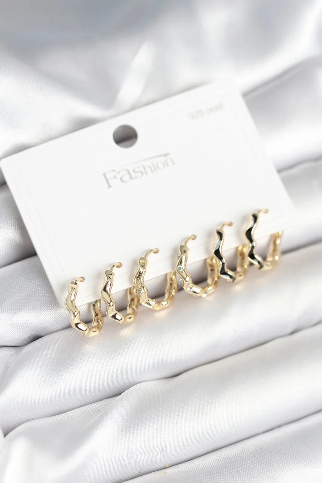 Gold Renk Pirinç Zikzak Model 925 Ayar Gümüş Çivili Kadın Küpe Seti