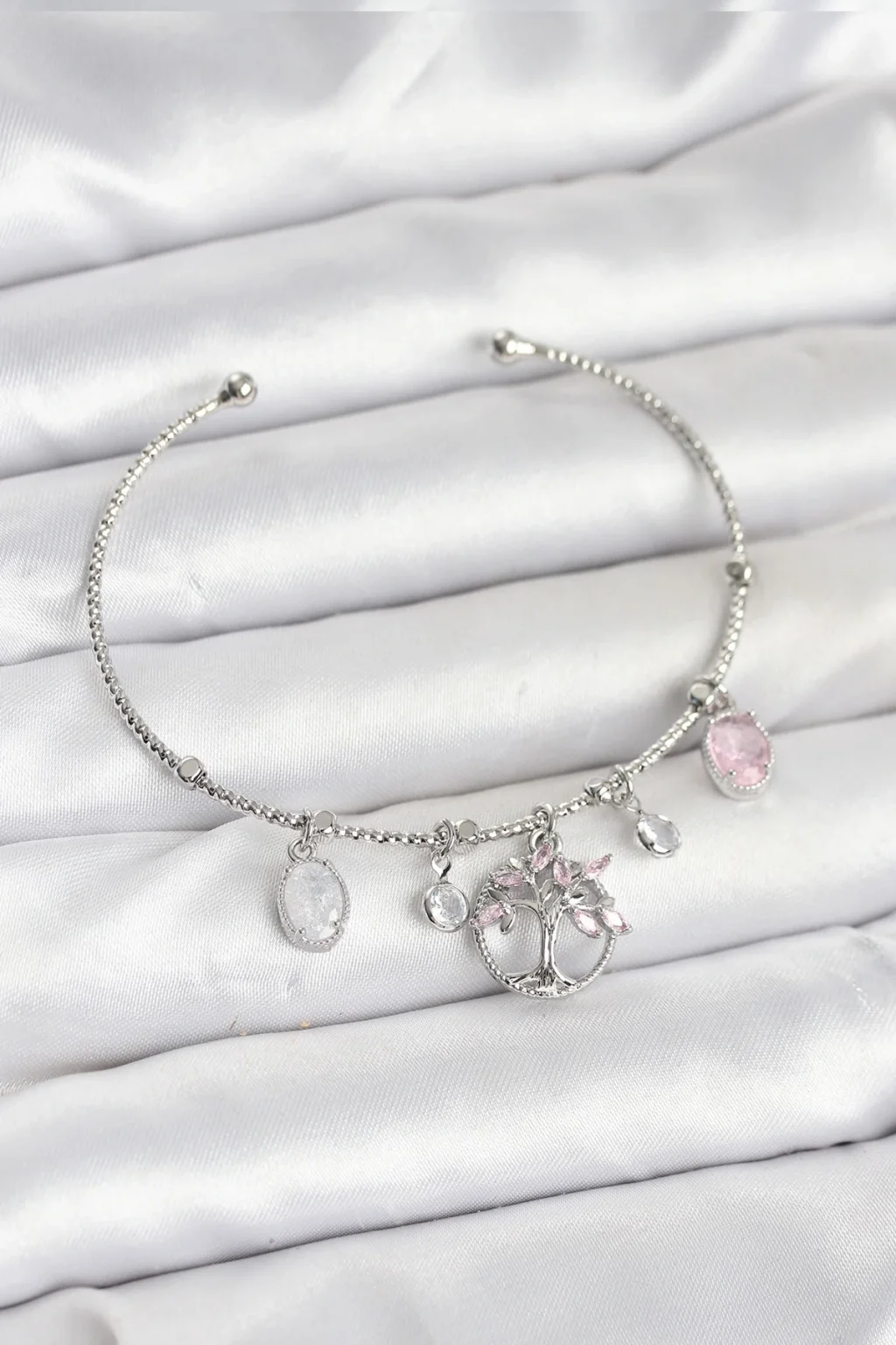 Hayat Ağacı Charmlı Gümüş Renk Pirinç Kadın Bileklik
