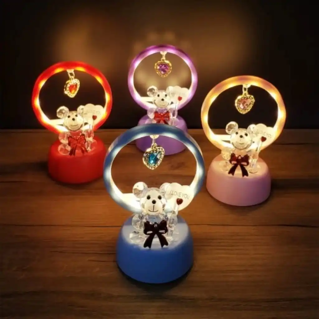 IŞIKLI I LOVE YOU AYICIKÜrün ÖzellikleriIşıklı I Love You Ayıcık, rengarenk gövdesi ve oturan kristal ayıcığıyla oldukça dikkat çekici bir dekoratif biblo olarak tasarlanmıştır. Sevgililer Günü, doğum günü veya özel günlerde hediye edilebilecek en şık seçeneklerden biridir. Gece lambası olarak kullanılan bu ayıcığın asılı olan kalp motifi, ona farklı bir görünüm kazandırır. Karanlıkta yakıldığında ortama hoş bir ışık yayarak ortamın atmosferini değiştirir. Kaliteli plastik malzemeden üretilmiş olup, kristal görünümlüdür. 13x7 cm boyutundadır. 3 adet ince kalem pil ile çalışır, piller pakete dahil değildir. Ayıcığın kalp balonunun içinde "I love you" yazısı bulunur. Ürün, stok durumuna göre  karışık renklerde gönderilir.Paket İçeriği1 Adet Işıklı I Love You Ayıcık