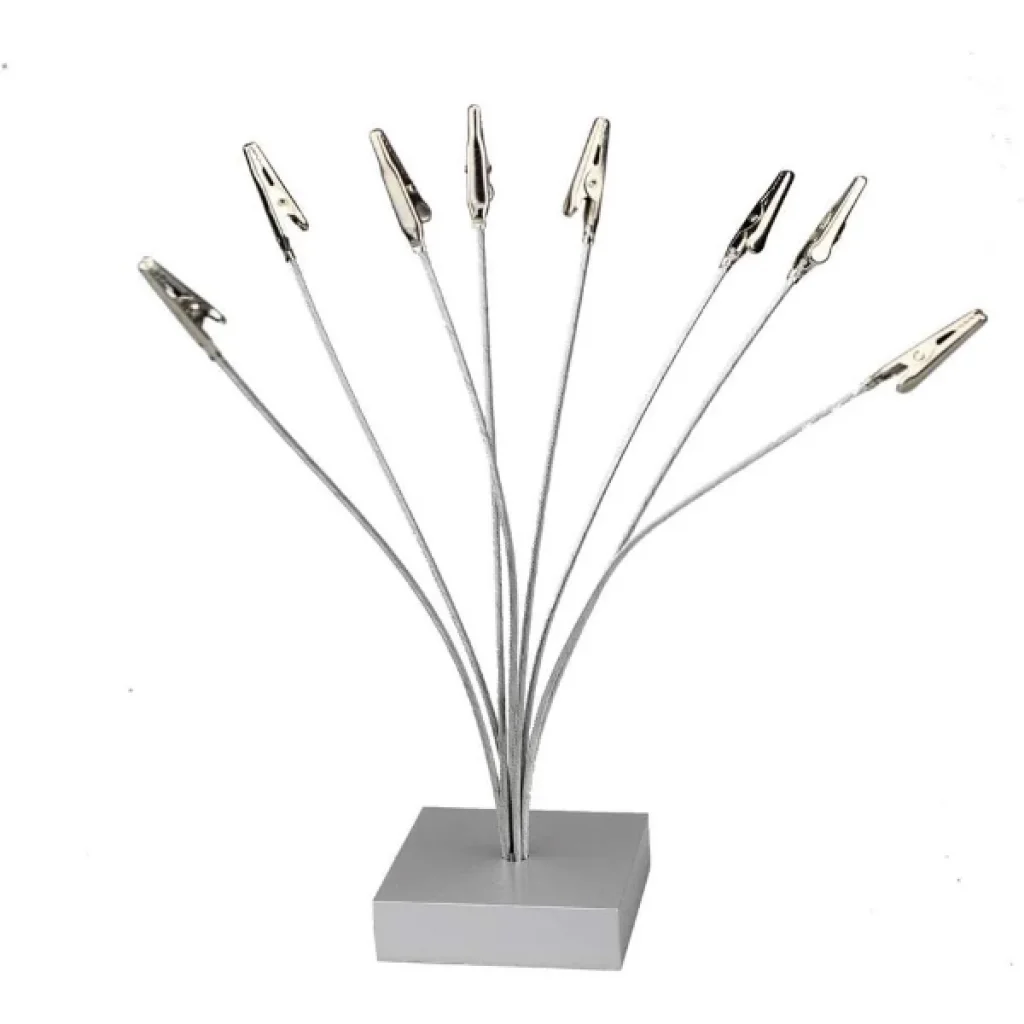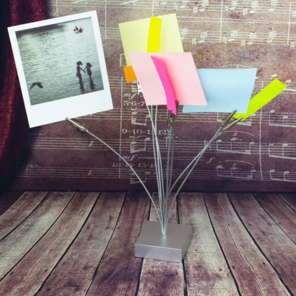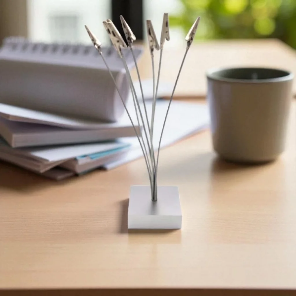KAĞIT TUTACAĞI KISKAÇLIÜrün ÖzellikleriMasa düzeninizi korumanın en şık yollarından biri olan Kıskaçlı Kağıt Tutacağı, ofis, çalışma alanı veya resepsiyon masalarında pratik kullanım sağlar. 24x7 cm boyutlarındaki bu ürün, çoklu metal kıskaç sistemiyle notlarınızı, kartvizitlerinizi, fotoğraflarınızı veya önemli belgelerinizi düzenli şekilde sergilemenize imkân tanır.Esnek metal telleri sayesinde farklı yükseklik ve açıları kolayca ayarlayabilir, belgeleri estetik bir biçimde konumlandırabilirsiniz. Sağlam tabanı devrilmeyi önlerken, paslanmaz çelikten üretilmiş kıskaçları uzun ömürlü kullanım sunar. Minimalist ve modern tasarımıyla masa üstü dekorasyonuna da zarif bir dokunuş katar.Paket İçeriği1 adet Kıskaçlı Kağıt Tutacağı