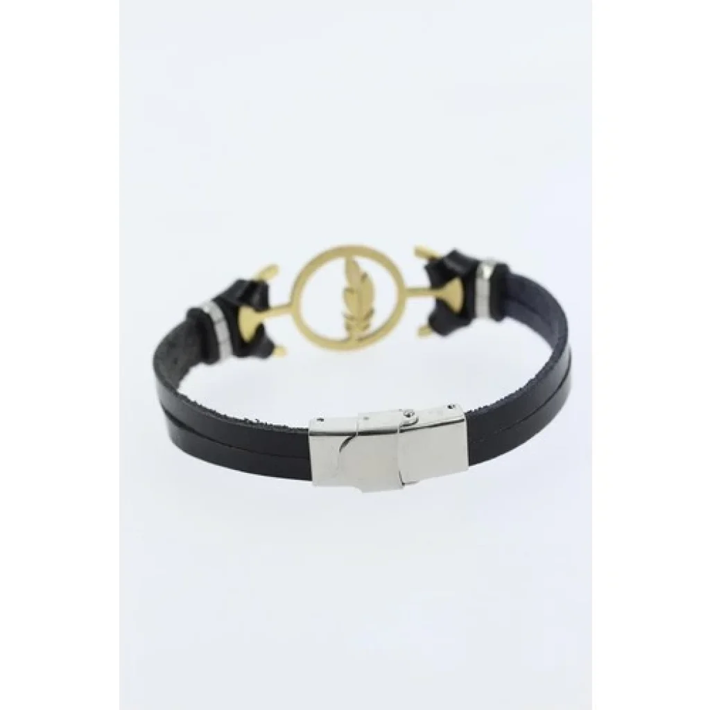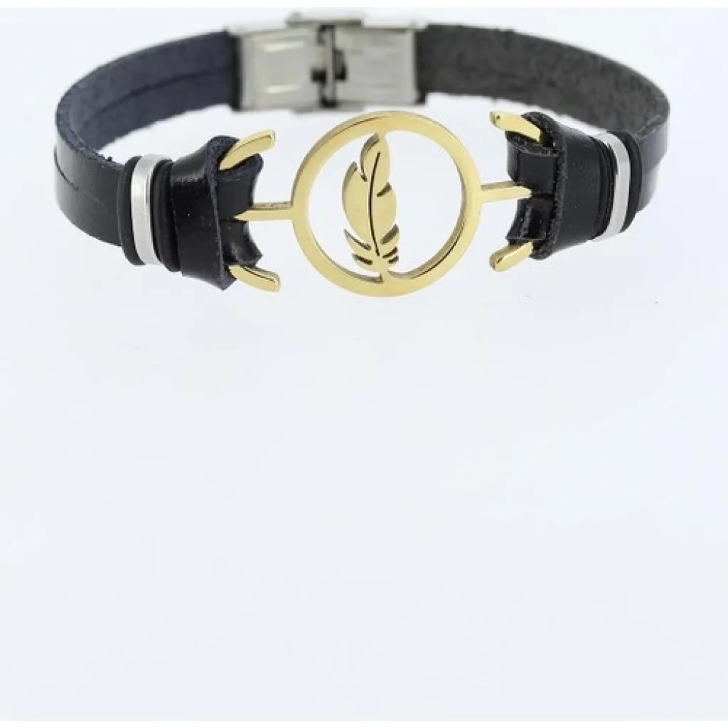 Karce CLZ741 - Gold Renk Tüy Figürlü Metal Aksesuarlı Siyah Renk Deri Erkek Bileklik