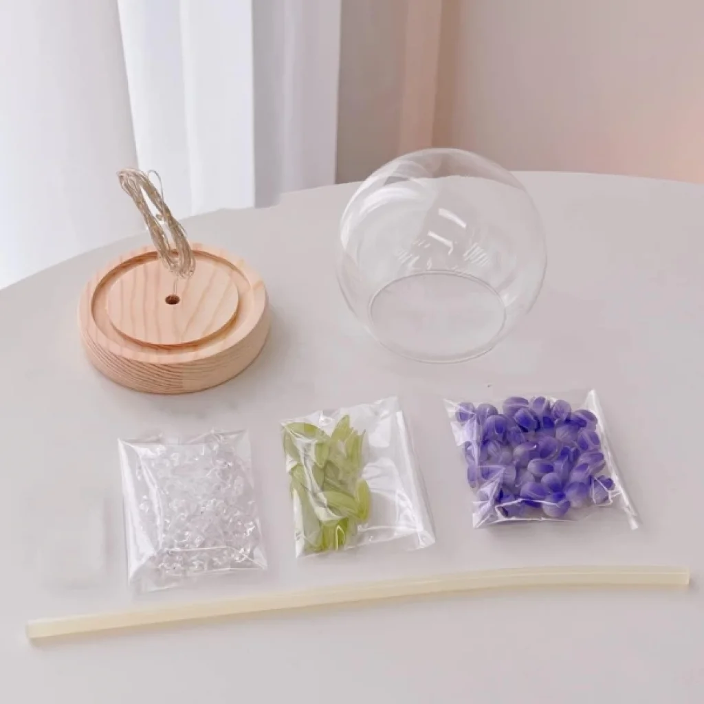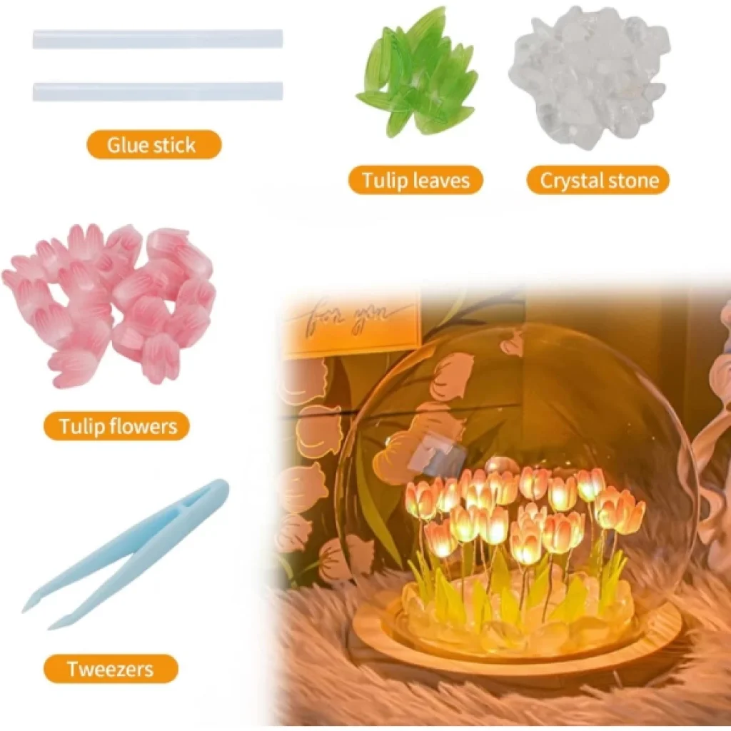 LED IŞIKLI KENDİN YAP LALE CAM KÜREÜrün ÖzellikleriŞeffaf cam fanus, yapay lale çiçekleri, kristal taşlar ve ahşap taban. LED ışıklarla donatarak, sıcak bir ışık yayarak hoş bir atmosfer oluşturur.Lale çiçekleri, lale yaprakları, kristal taşlar, yapıştırıcı çubukları ve cımbız gibi aksesuarlarla birlikte gelir. Çiçeklerin ve dekorasyon öğelerinin yerleştirilmesi kullanıcı tarafından yapılır. Kompakt yapısıyla masalar, raflar veya yatak odası dekorasyonu için idealdir. Ev dekorasyonu, romantik sürprizler, hediyelik eşya veya gece lambası olarak kullanılabilir. Kendi dekorasyonunuzu oluşturabileceğiniz yaratıcı bir deneyim sunar.LED ışıklar, düşük enerji tüketimi ve uzun ömürlülük sağlar. Modern ve zarif tasarımıyla her türlü yaşam alanına uyum sağlar.Bu ürün, özellikle özel günlerde hediye olarak da tercih edilebilecek şık ve işlevsel bir dekoratif aksesuardır.Paket İçeriği1 adet Cam Fanus1 adet Ahşap Taban1 adet LED Işık Şeridi1 adet Yapay Lale Çiçek Seti1 adet Kristal Taş Paketi1 adet Yapıştırıcı Çubuğu1 adet Cımbız
