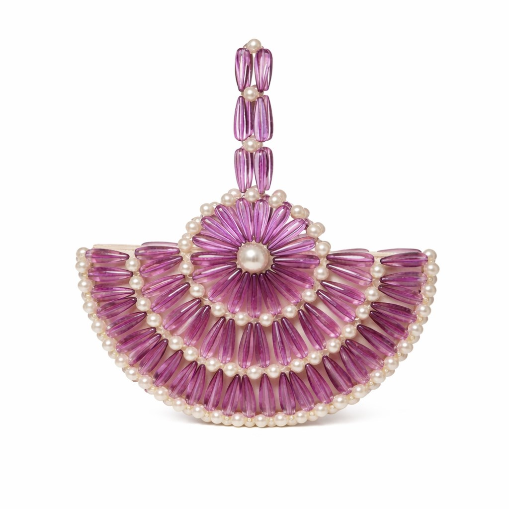 Atelier Emine’in Crystal Gelato Couture koleksiyonuna ait Melo Iris, merkezden dışa doğru genişleyen radyal örgü mimarisiyle tasarlanmış, heykelsi karaktere sahip premium el yapımı kristal mini çanta modelidir.