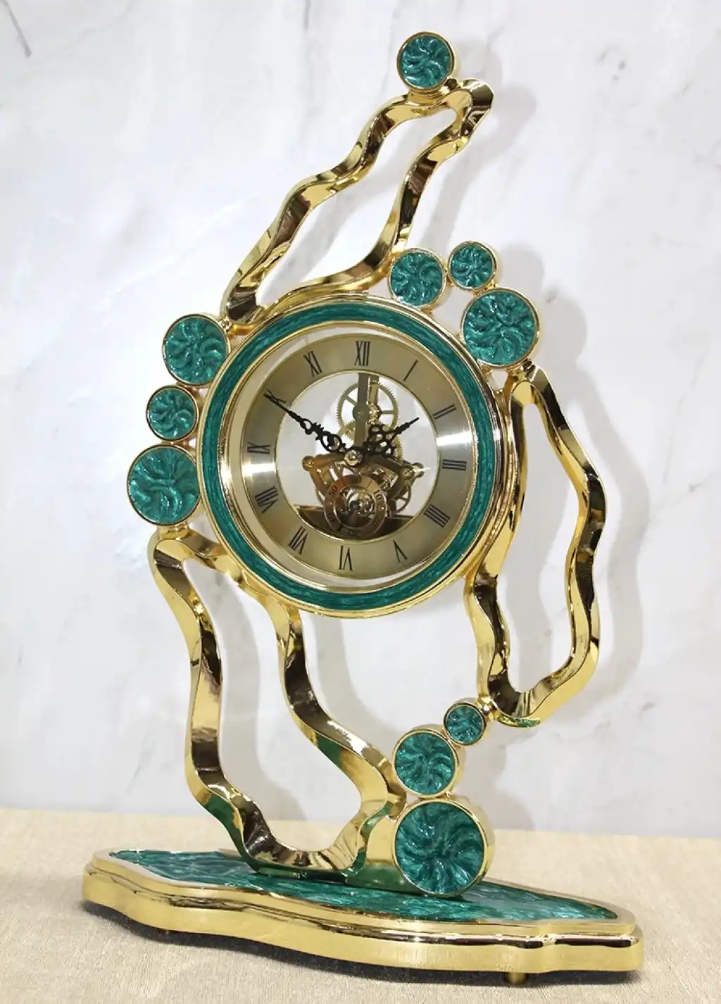 ÖZEL YEŞİM TASARIM MASA ÜSTÜ SAAT Ürün ÖzellikleriÖzel yeşim tasarımlı masa üstü saat, zarif görünümüyle dekoratif ve işlevsel bir parça sunar. Altın tonları ile yeşilin uyumunu yansıtan şık tasarımı, hem klasik hem de modern dekorasyonlarla uyum sağlar. 41x27 cm ölçüleri sayesinde masa üstünde dikkat çekici bir obje olurken aynı zamanda zamanı takip etmenizi kolaylaştırır. Kaliteli malzemeden üretilmiş olup uzun süreli kullanım için idealdir. Evinize, ofisinize ya da sevdiklerinize hediye olarak tercih edilebilecek özel bir dekoratif aksesuardır.Paket İçeriği1 adet Özel Yeşim Tasarım Masa Üstü Saat