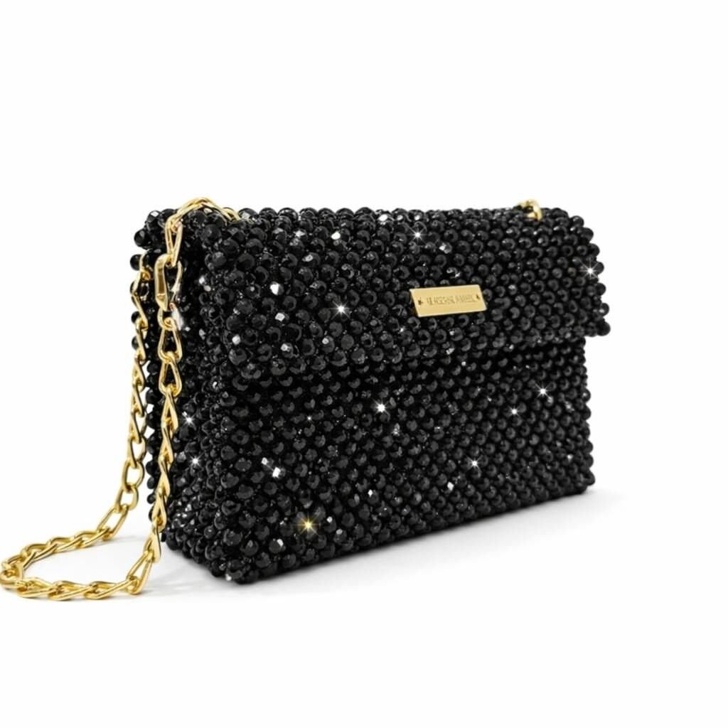 Atelier Emine’in Crystal Gelato Couture serisine ait Panna Eclipse, 8 mm optik sınıfı kristal boncuklar, metal omuz zinciri ve saten astar kullanılarak tamamen el işçiliğiyle üretilmiş premium clutch modelidir.