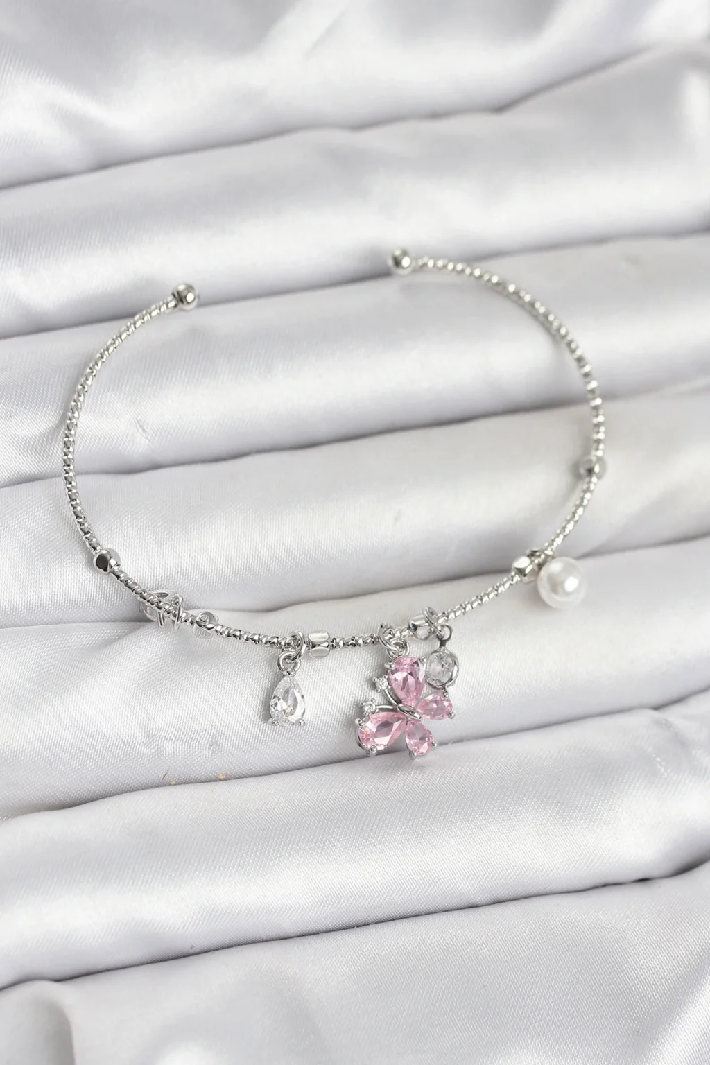 Pembe Kelebek Charmlı Gümüş Renk Kadın Bileklik