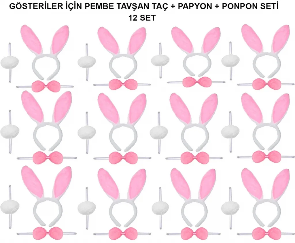 PEMBE TAVŞAN KOSTÜM SETİ – TAÇ, PAPYON, PONPON (12’Lİ PAKET)Ürün ÖzellikleriPembe Tavşan Kostüm Seti, 12'li paket halinde sunulur ve her set, sevimli bir tavşan görünümü için taç, papyon ve ponpon içerir. Pembe renkli tasarımıyla çocuklar için ideal olan bu set, kostüm partileri, okul etkinlikleri veya doğum günü kutlamaları gibi özel günlerde kullanılabilir. Her bir parça, rahat ve esnek malzemelerden üretilmiştir, böylece uzun süre rahatlıkla kullanılabilir. Set, grup etkinlikleri ve toplu kostüm etkinliklerinde kullanmak için mükemmel bir tercihtir.Paket İçeriği12 Adet Pembe Tavşan Kostüm Seti (Her Set: 1 Adet Taç, 1 Adet Papyon, 1 Adet Ponpon)
