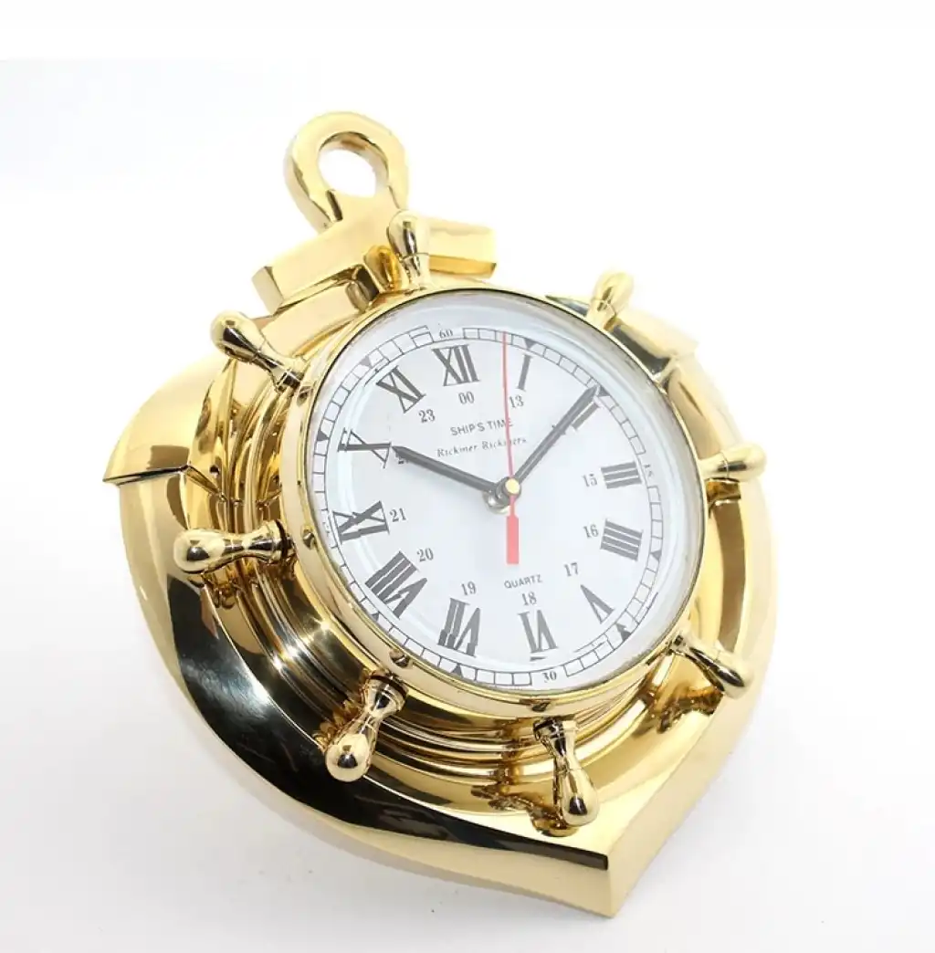 PİRİNÇ ÇAPA TASARIMLI DÜMENLİ SAATÜrün ÖzellikleriPirinç çapa tasarımlı dümenli saat, denizcilik temalı şık ve nostaljik bir dekoratif üründür. Tamamen pirinç malzemeden üretilmiş olup, 30x25 cm boyutundadır. Çapa ve dümen detayları ile denizcilik konseptine uygun olarak tasarlanmıştır. Gövdesi dayanıklı ve parlak pirinç kaplama ile tamamlanmış olup, klasik Roma rakamlı kadranı ile estetik bir görünüm sunar. Hem duvar hem de masa saati olarak kullanılabilir. Denizci temalı dekorasyon sevenler için harika bir seçenek olup, ofis veya ev ortamlarında şık bir atmosfer oluşturur.Paket İçeriği1 Adet Pirinç Çapa Tasarımlı Dümenli Saat