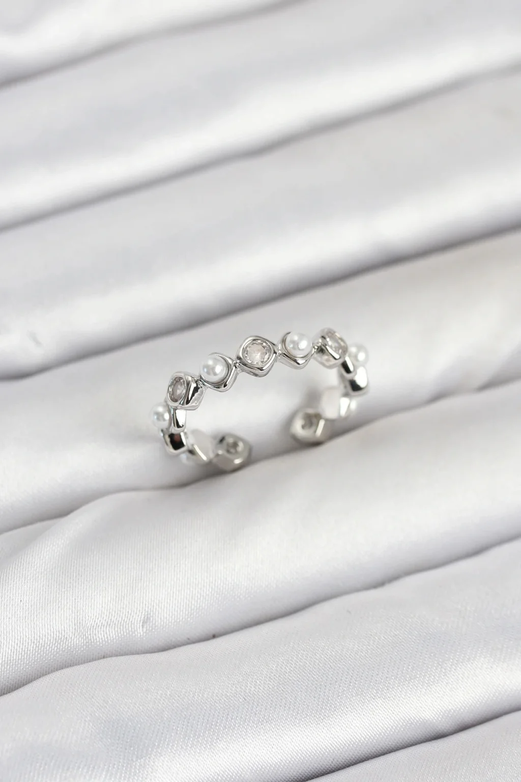 Pirinç Gümüş Renk Zirkon Taşlı İncili Kadın Yüzük