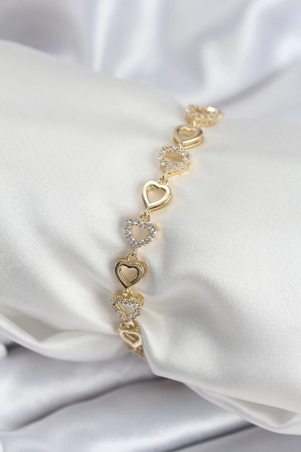 Pirinç VIP Seri Gold Renk Sıralı Kalp Model Kadın Bileklik