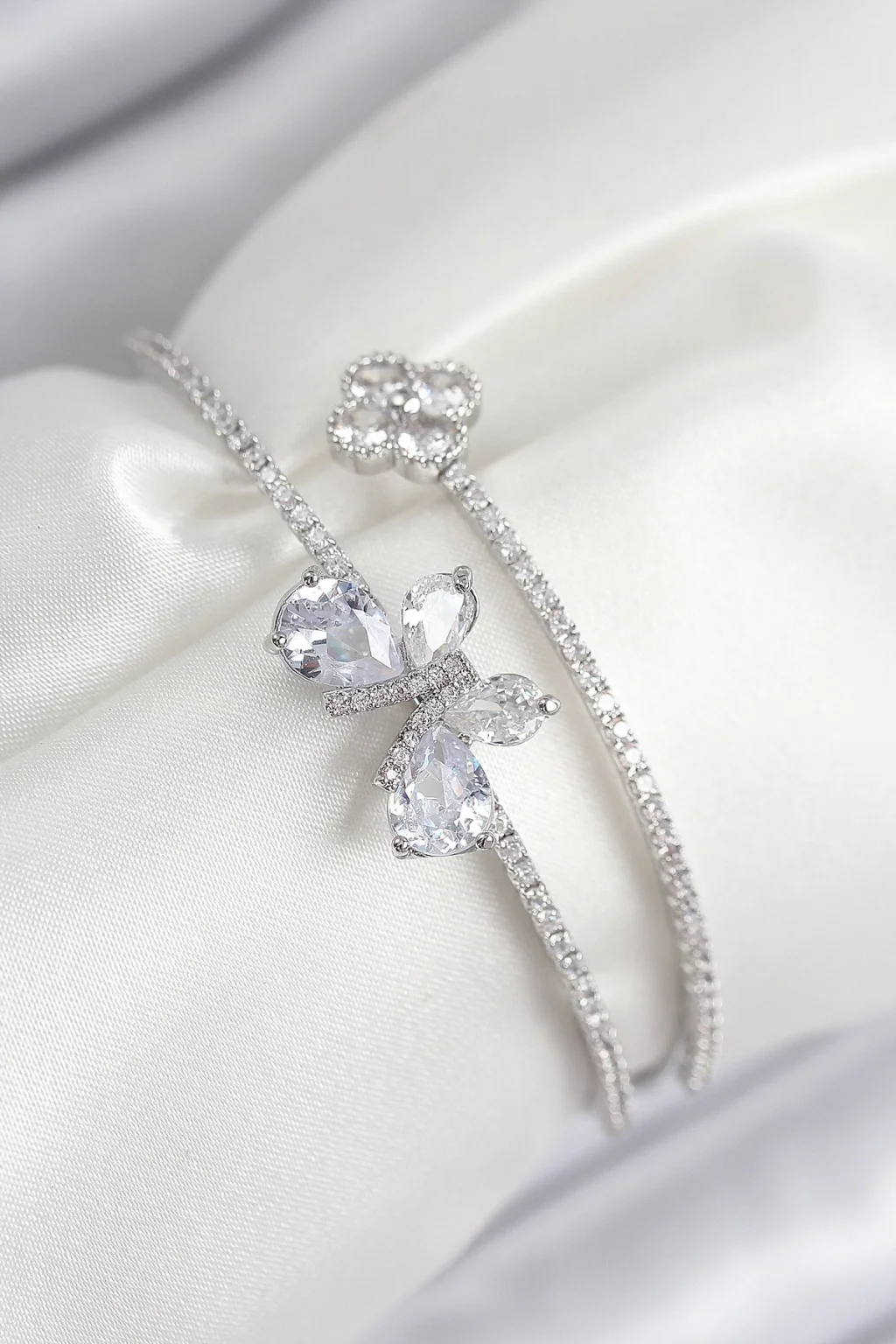Pirinç Zirkon Taşlı Kelebek Ve Yonca Model Gümüş Renk Kadın Bileklik