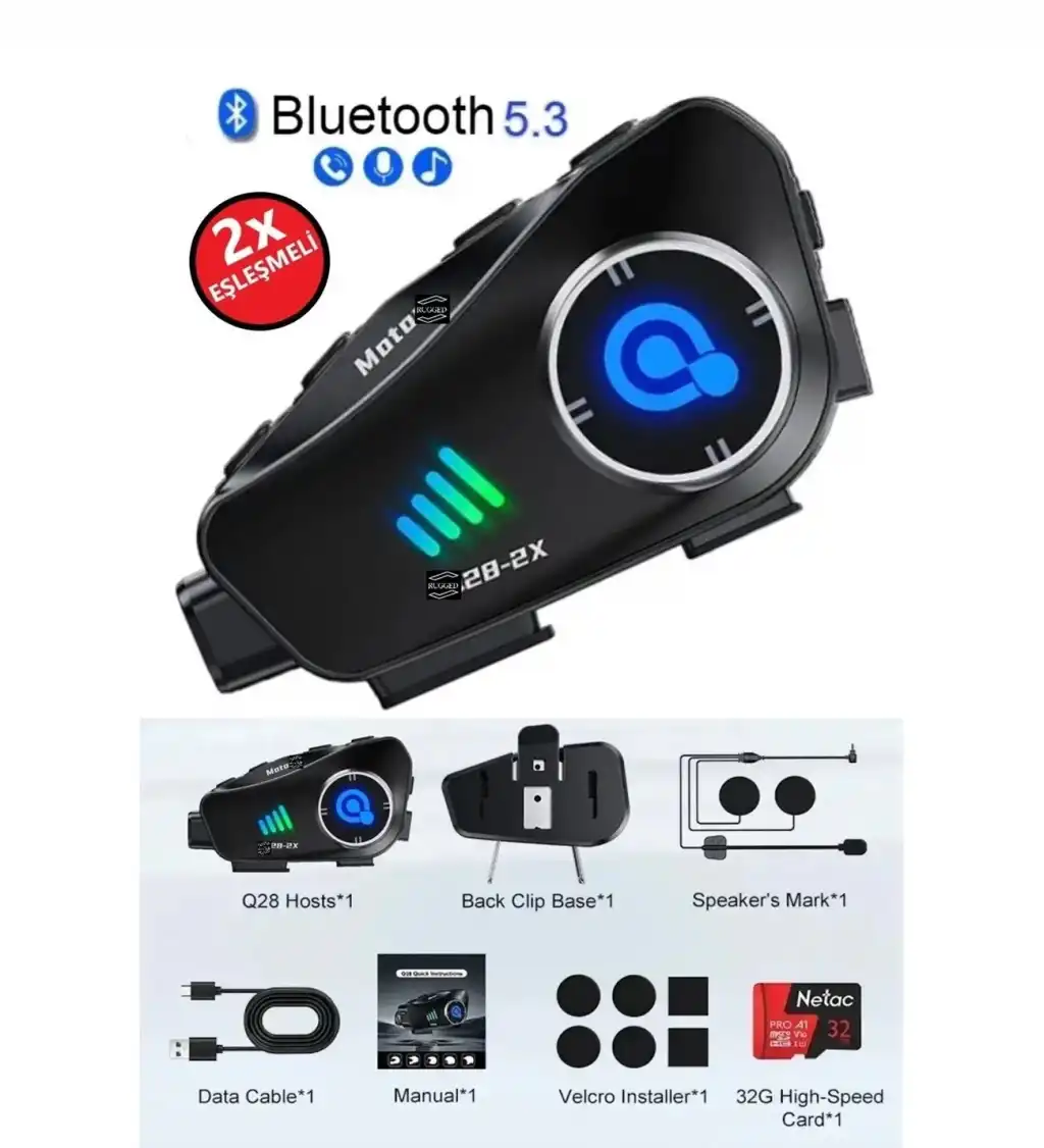 Q28 2x 2 Eşleşmeli Motosiklet Kask Bluetooth Kulaklık 1080p Kamera Su Geçirmez Intercom