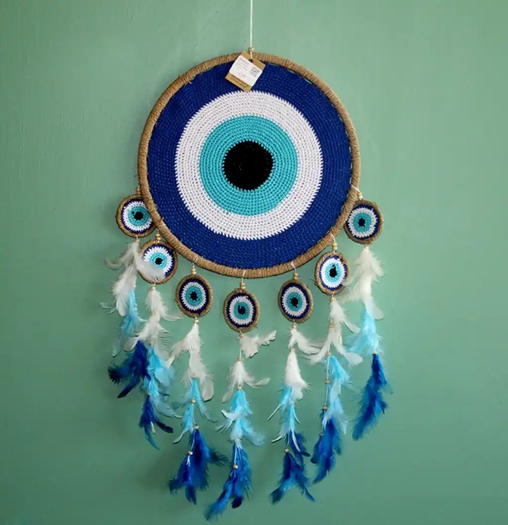 RÜYA KAPANI DREAM CATCHER MODEL 19Ürün ÖzellikleriRüya Kapanı Dream Catcher Model 19, iplerle işlenmiş nazar boncuğu süslemeleri ve mavi-beyaz tüyler ile zarif bir şekilde tasarlanmış bir üründür. Nazar boncuğu, kötü enerjilerden korunmayı simgelerken, mavi-beyaz tüyler huzur verici bir atmosfer yaratır. Bu dream catcher, hem koruyucu hem de dekoratif işleviyle her alanda şık bir görünüm sağlar. Hafif yapısı sayesinde her mekanda kolayca asılabilir ve evinize estetik bir dokunuş katar. Hem geleneksel hem de modern dekorasyon için mükemmel bir seçimdir.Paket İçeriği1 adet Rüya Kapanı Dream Catcher Model 19.
