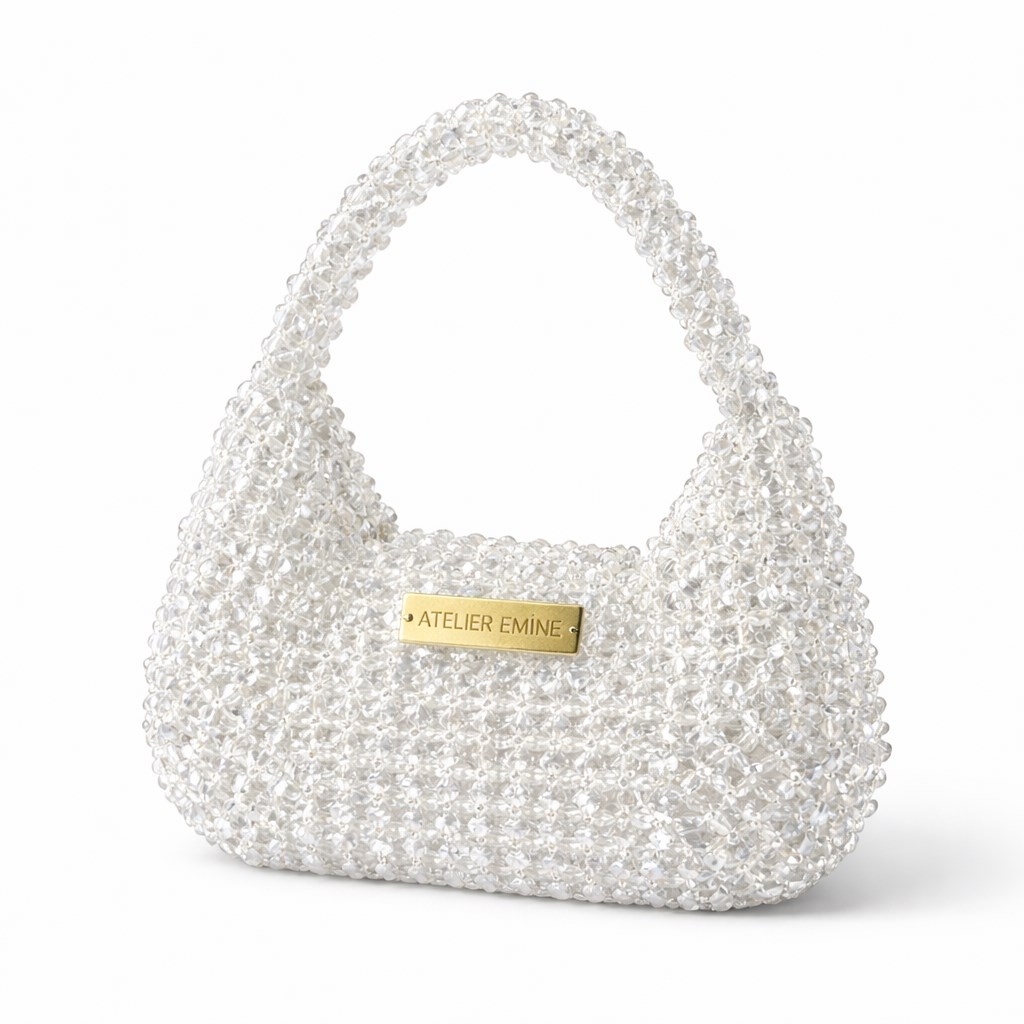 Atelier Emine’in Crystal Gelato Couture koleksiyonuna ait Stracci Vanille, 8 mm optik sınıfı kristal boncukların yüksek dayanımlı misina ile tek tek örülmesiyle tamamen el işçiliğiyle üretilmiş, yumuşak geçişli ve dengeli hacme sahip premium mini çanta modelidir.
