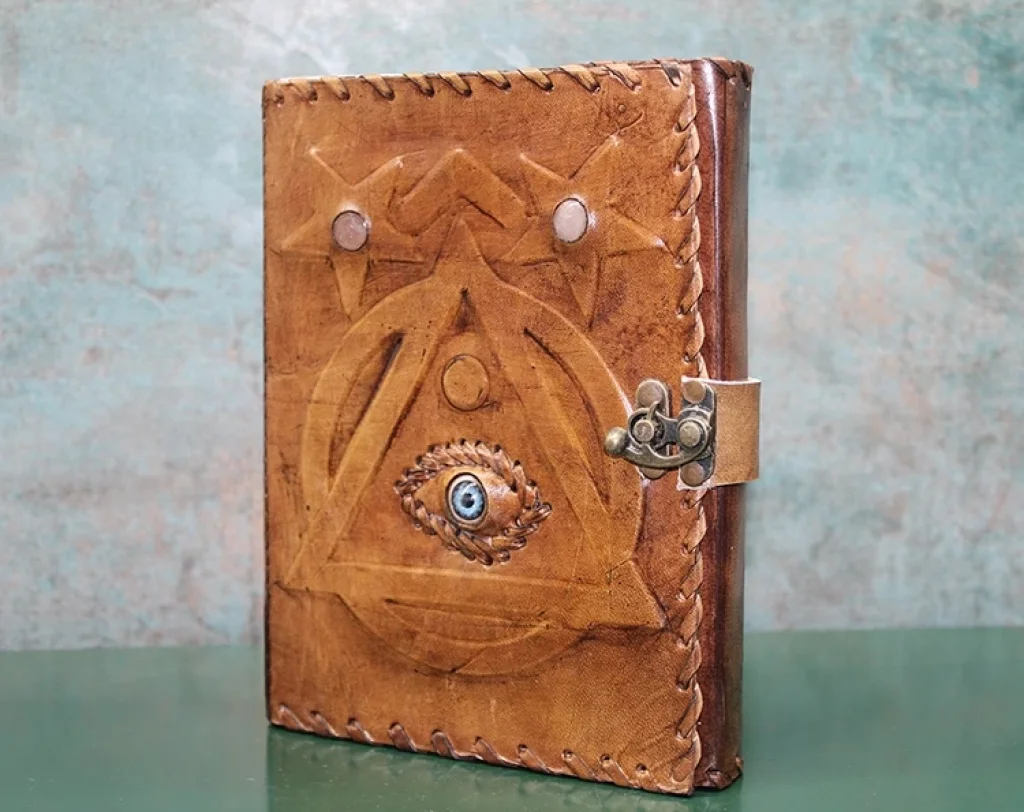 TAŞLI DERİ DEFTER MODEL 1Ürün ÖzellikleriTaşlı Deri Defter Model 1, mistik tasarım ve göz ile üçgen figürleri içeren benzersiz bir defterdir. Deri kapak, şıklık ve dayanıklılık sağlar, taşlarla yapılan süslemeler deftere özel bir hava katmaktadır. 20x15 cm ölçülerindeki bu defter, özelleştirilmiş tasarımı sayesinde hem günlük kullanım hem de hediye olarak idealdir. Kaliteli malzeme ve el yapımı dokunuşu, defteri uzun süreli kullanımlar için dayanıklı hale getirir. Hem yazı yazmak hem de not almak için mükemmel bir araçtır.Paket İçeriği1 adet Taşlı Deri Defter Model 1.