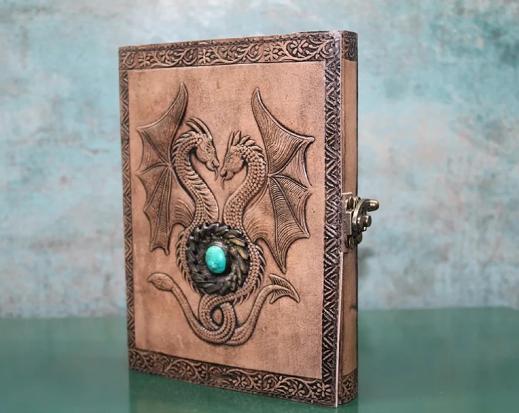 TAŞLI DERİ DEFTER MODEL 8Ürün ÖzellikleriTaşlı Deri Defter Model 8, ejderha işlemeli tasarımı ile dikkat çeker. Ejderha figürü, güç ve bilgeliği simgelerken, taşlarla süslenmiş kapak tasarımı ise defteri daha da özel kılar. Deri kapak üzerine işlenmiş ejderha figürü, mistik ve fantastik bir havası olan defteri görsel olarak etkileyici hale getirir. 20x15 cm ölçülerindeki ideal boyutu, günlük kullanım için oldukça uygundur ve yazı yazarken rahatlık sağlar. Hem kişisel kullanım hem de hediye olarak harika bir tercihtir.Paket İçeriği1 adet Taşlı Deri Defter Model 8