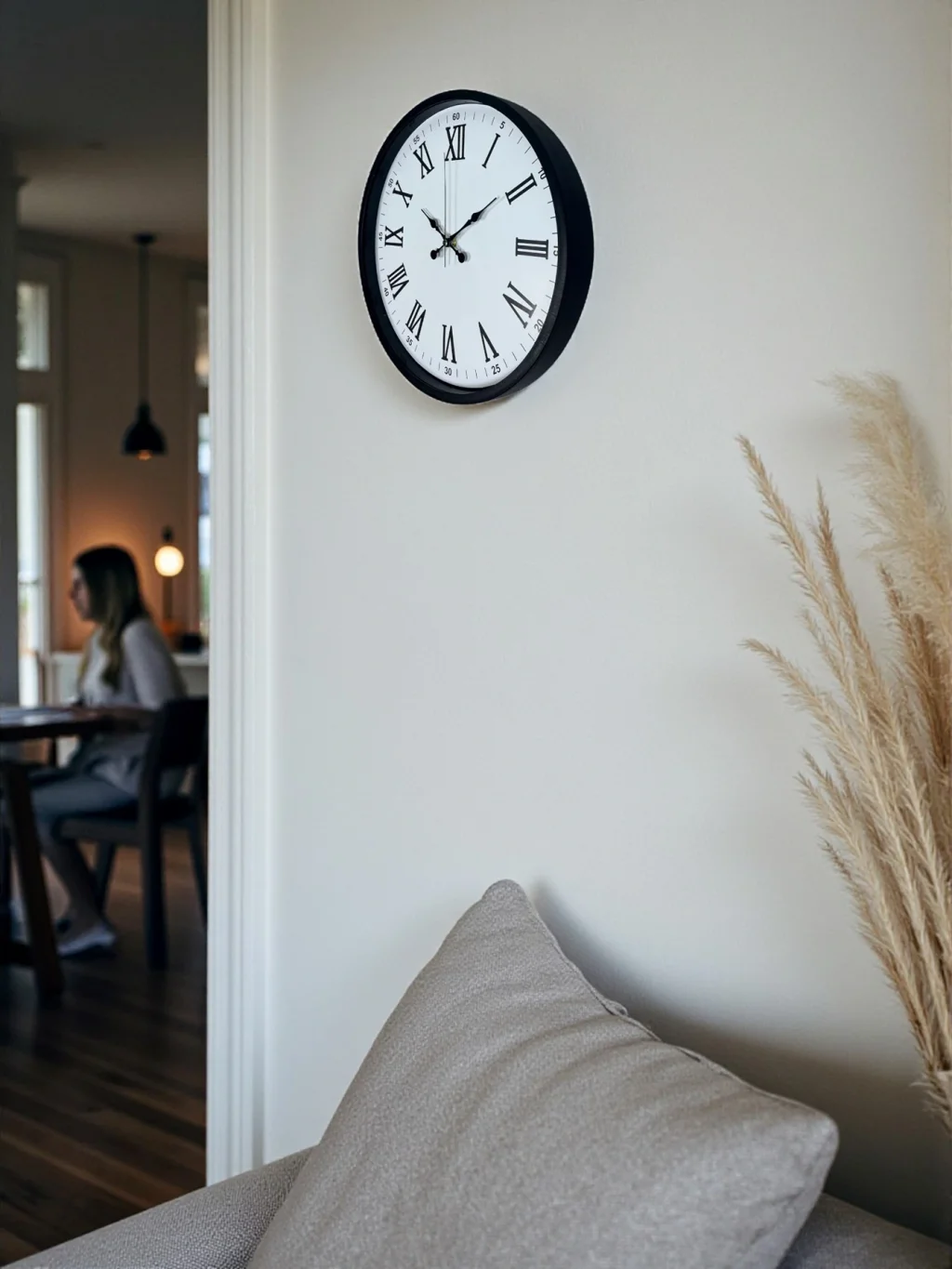 Siyah çerçeve rengi, beyaz zemin üzerine işlenmiş büyük ve okunabilir Roma rakamlarıyla güçlü bir kontrast oluşturarak uzak mesafeden bile net bir görüş sağlar. Sessiz akan saniye mekanizması, ses çıkarmadan çalışarak özellikle çalışma odası, yatak odası ve ofisler için ideal bir kullanım sunar. Klasik saat estetiğini sevenler için hem dekoratif hem de işlevsel bir üründür.